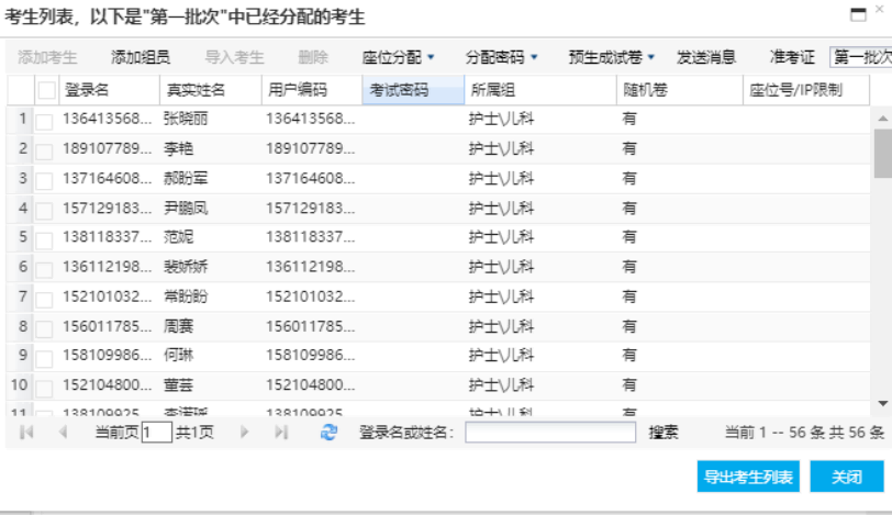 添加考生:按条件搜索学生,选择学生,添加到考试。